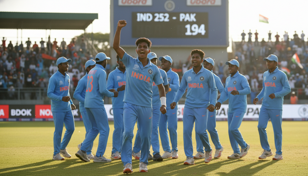 Under 19 World Cup 2026 के सबसे रोमांचक मुकाबले में भारत ने अपने चिर-प्रतिद्वंद्वी पाकिस्तान को 58 रनों से हराकर सेमीफाइनल में अपनी जगह पक्की कर ली है। 2 फरवरी 2026 की सुबह खेल जगत में इसी जीत की गूंज है। बुलावायो के क्वींस स्पोर्ट्स क्लब में खेले गए इस निर्णायक ‘सुपर सिक्स’ मैच में भारतीय युवा ब्रिगेड ने न केवल पाकिस्तान को टूर्नामेंट से बाहर का रास्ता दिखाया, बल्कि यह भी साबित कर दिया कि वे खिताब के सबसे प्रबल दावेदार क्यों हैं। यह जीत भारतीय क्रिकेट के भविष्य के लिए एक शुभ संकेत है।